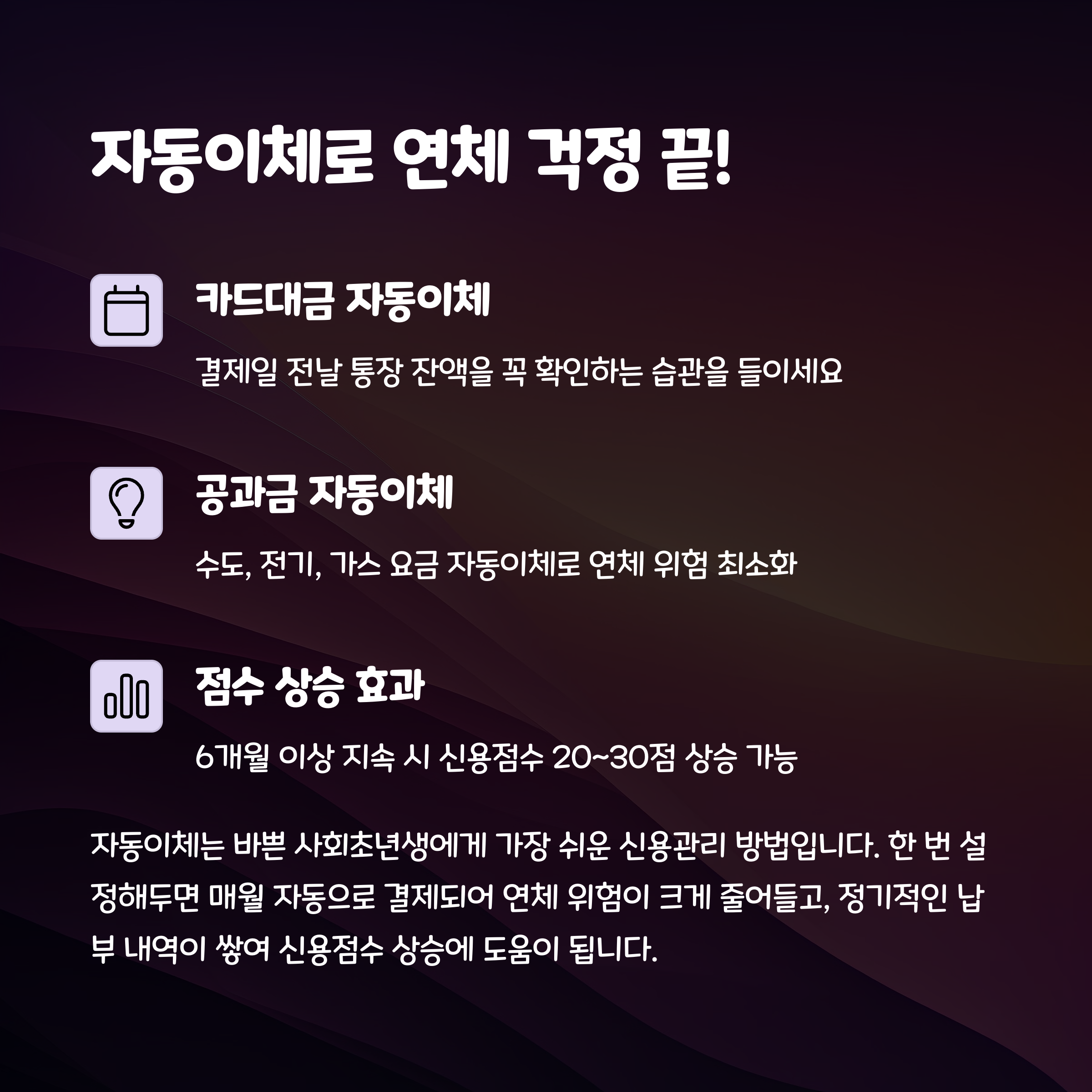 | 자동이체 설정 | 카드값, 공과금 등 연체 방지를 위해 필수 |