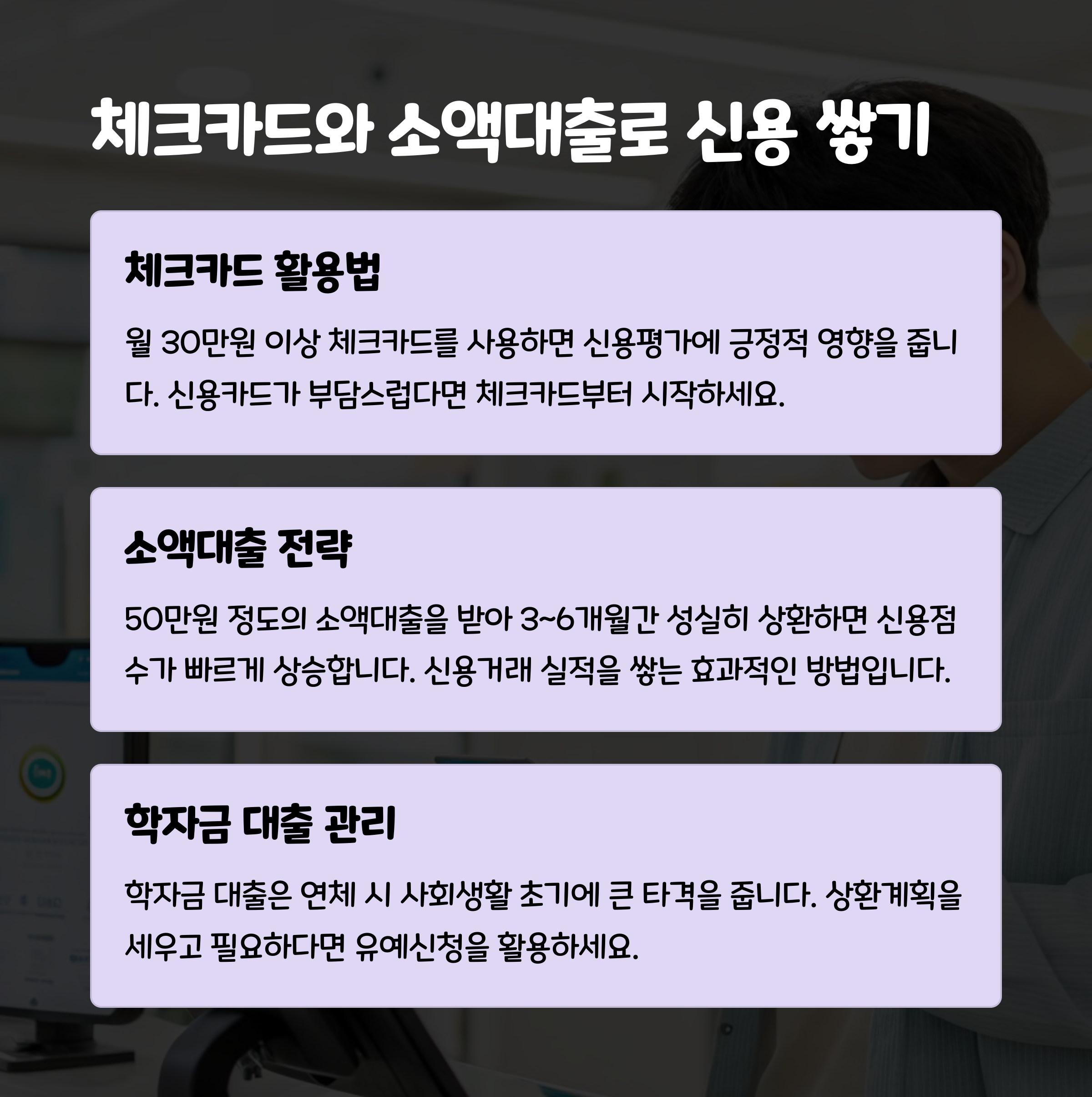 | 소액대출 상환 | 300만 원 이하 대출을 성실히 갚는 것이 신용 이력에 도움 |