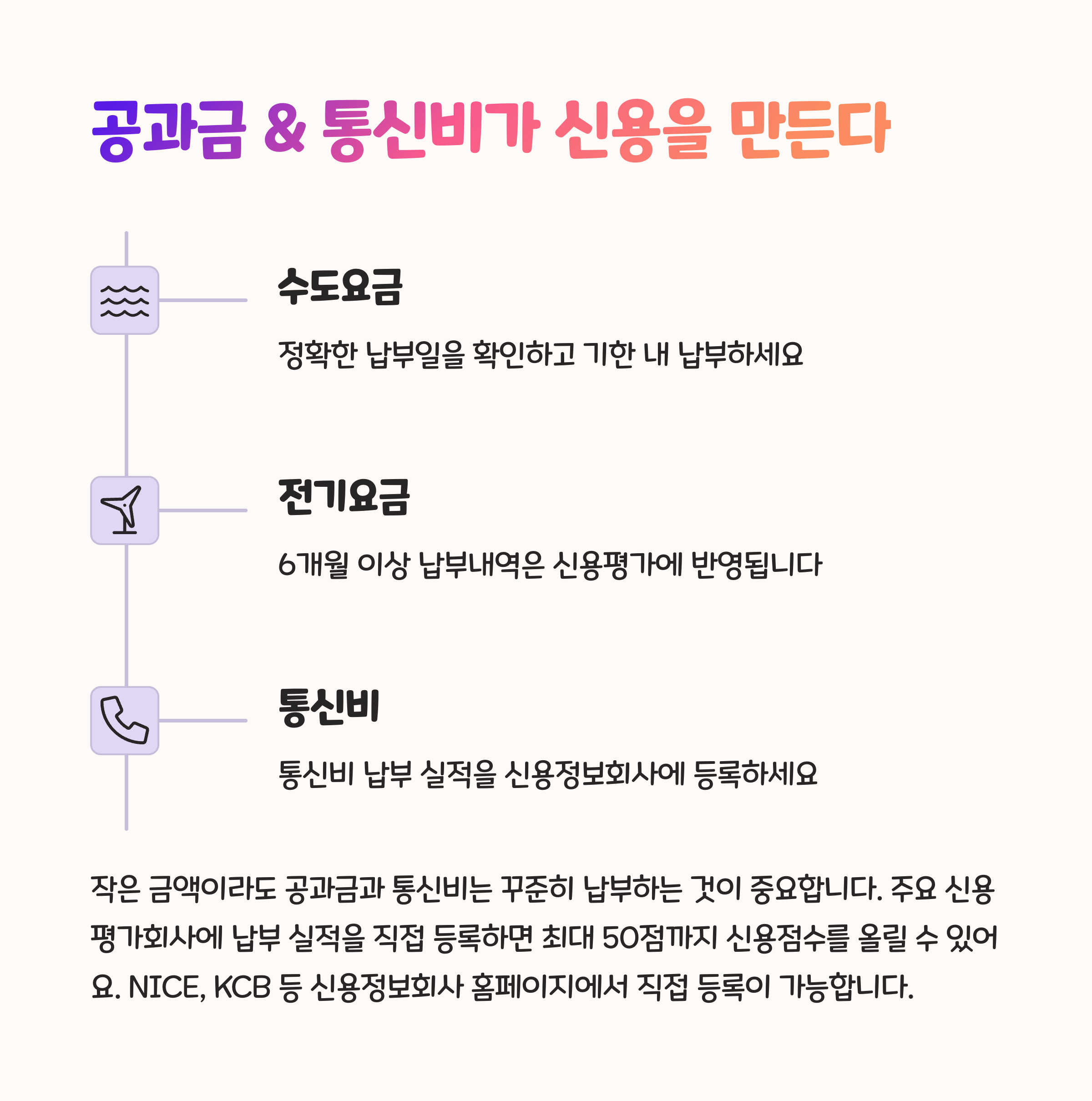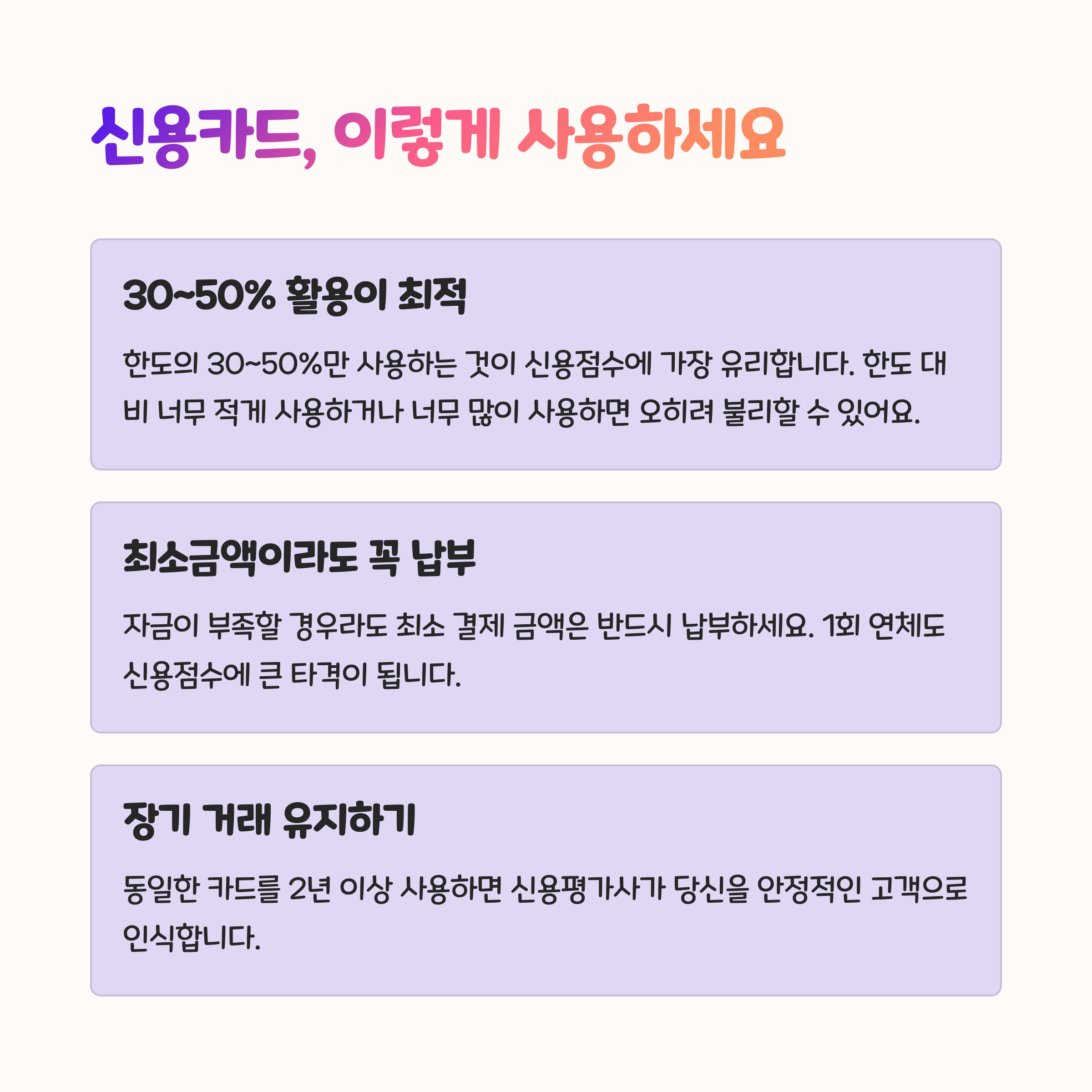 | 신용카드 활용 | 한도 30~50% 이내 사용이 점수 상승에 유리 |