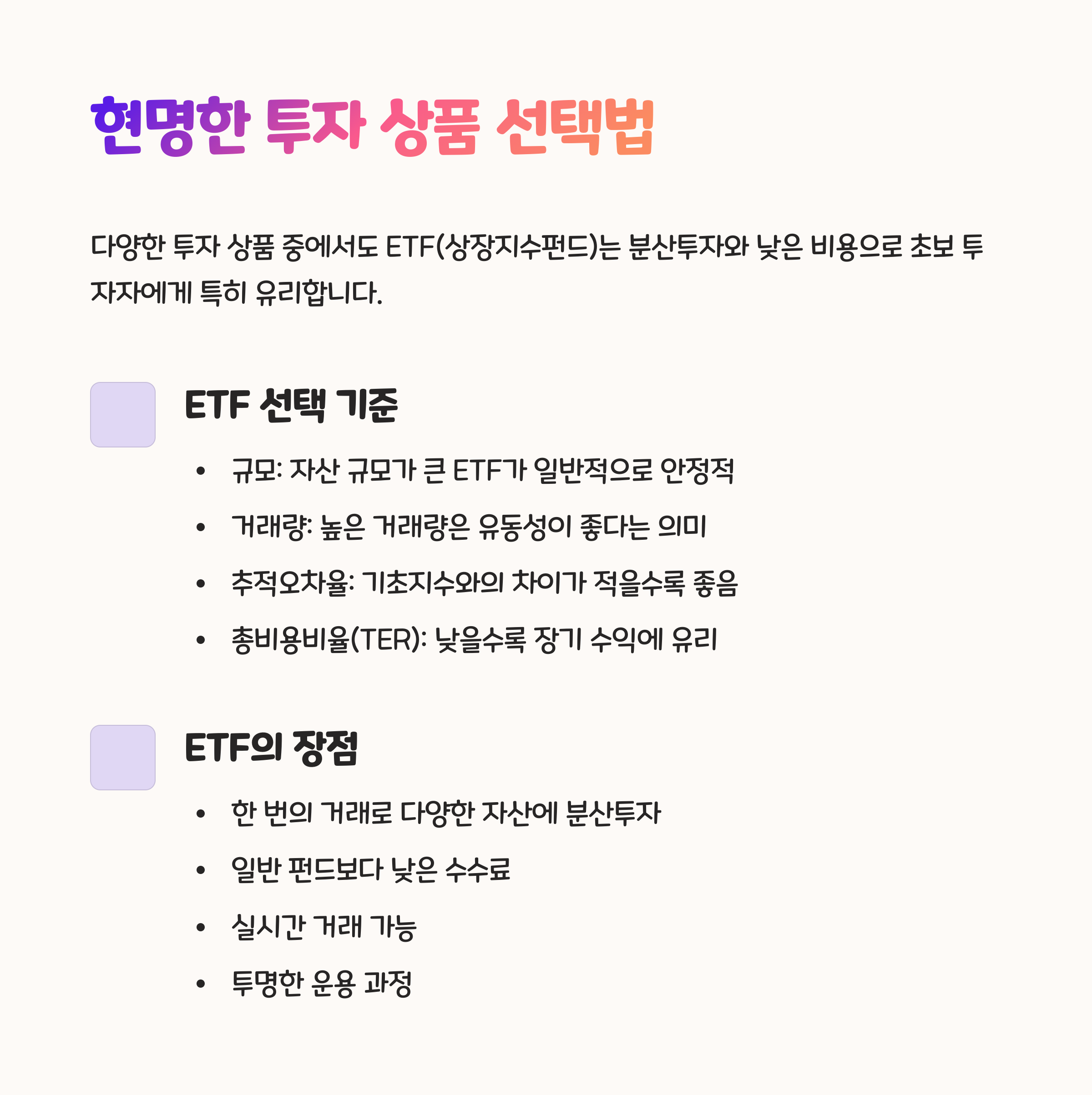 자산 분배율이 정해졌다면 이제는 구체적인 ‘무엇에 투자할 것인가’를 선택할 차례입니다. 주식, ETF, 펀드, 채권, 부동산, REITs 등 자산 클래스별로 다양한 상품들이 있으니까요. 요즘 저는 특히 ETF에 관심이 많아요. 개별 종목 고르기 어렵다면 ETF는 진짜 꿀템이에요.