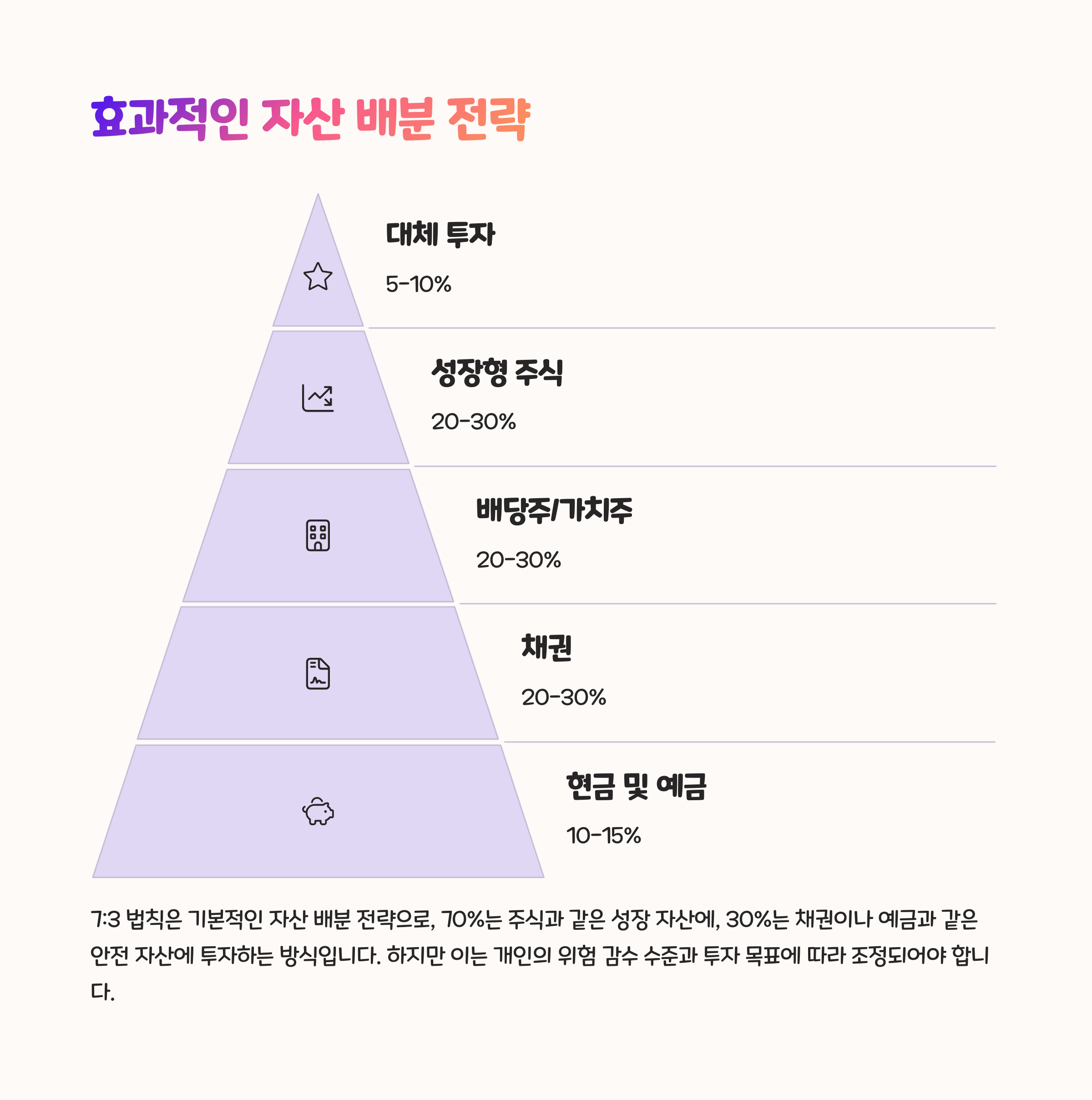 이제 본격적으로 숫자를 맞춰야 할 시간입니다! 주식, 채권, 예금, 부동산 등 어떤 자산을 얼마나 가져갈지 정하는 거죠. 이때 중요한 건, 위험 감수도와 투자 목표를 바탕으로 균형 있게 조합하는 거예요.
