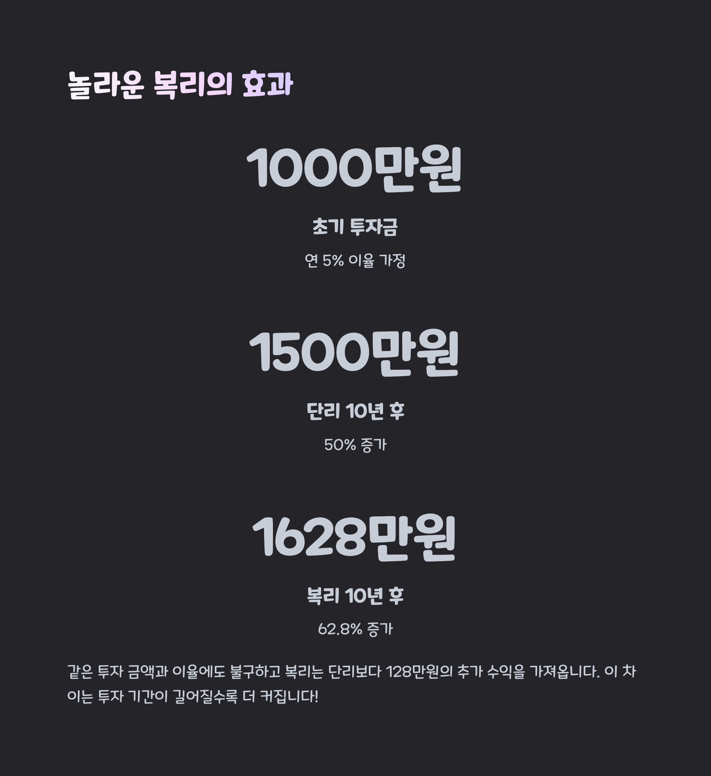 투자 기간이 짧으면 단리가 더 간단하고 유리할 수 있지만, 장기적으로 보면 복리가 이자 수익을 훨씬 더 많이 가져다줍니다.