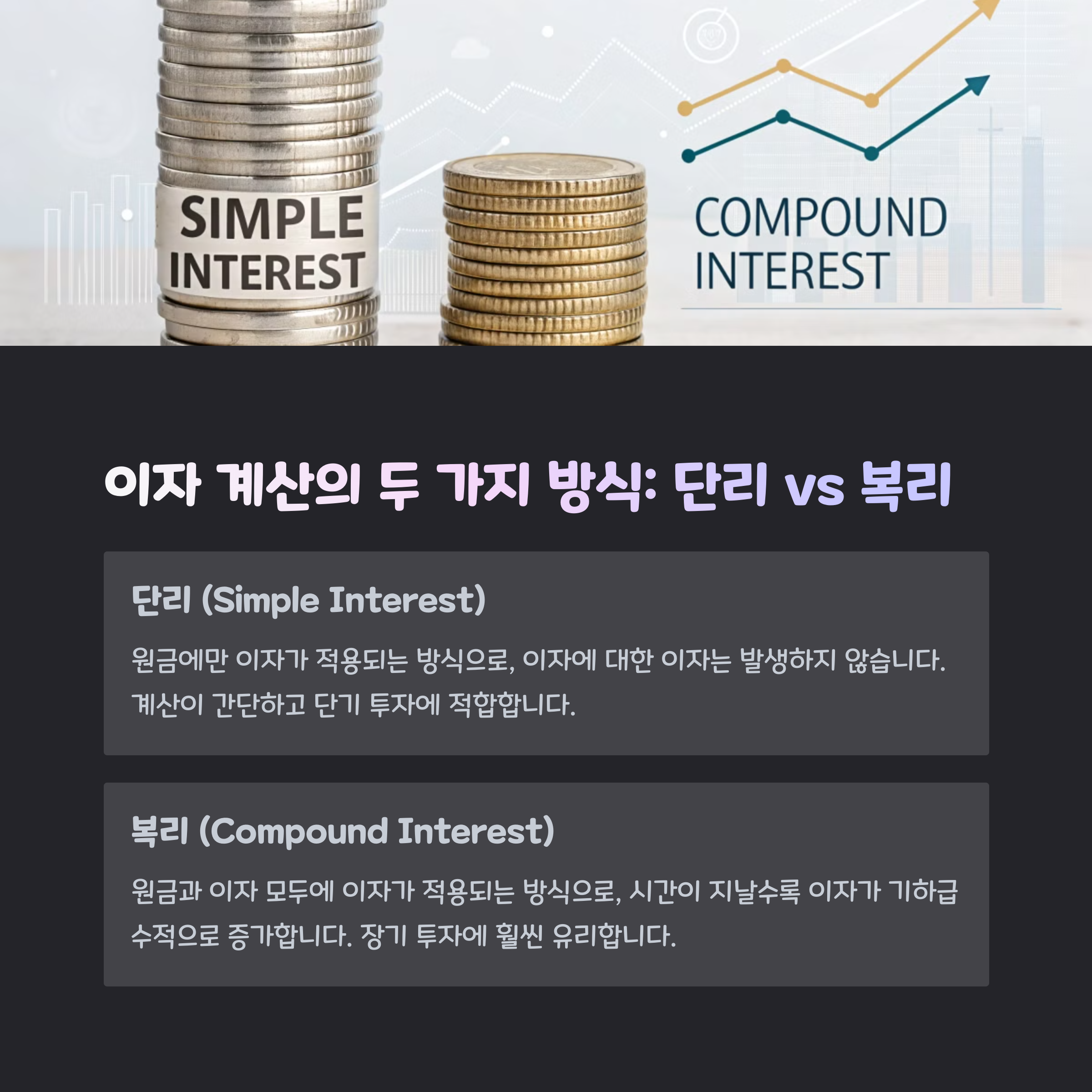복리는 이자의 이자까지 계산하는 마법 같은 방식이에요. 처음엔 단리랑 차이 없다가도, 몇 년만 지나면 어마어마한 차이를 만들어내죠. 특히 장기 투자할 땐 무조건 알아야 할 개념입니다.