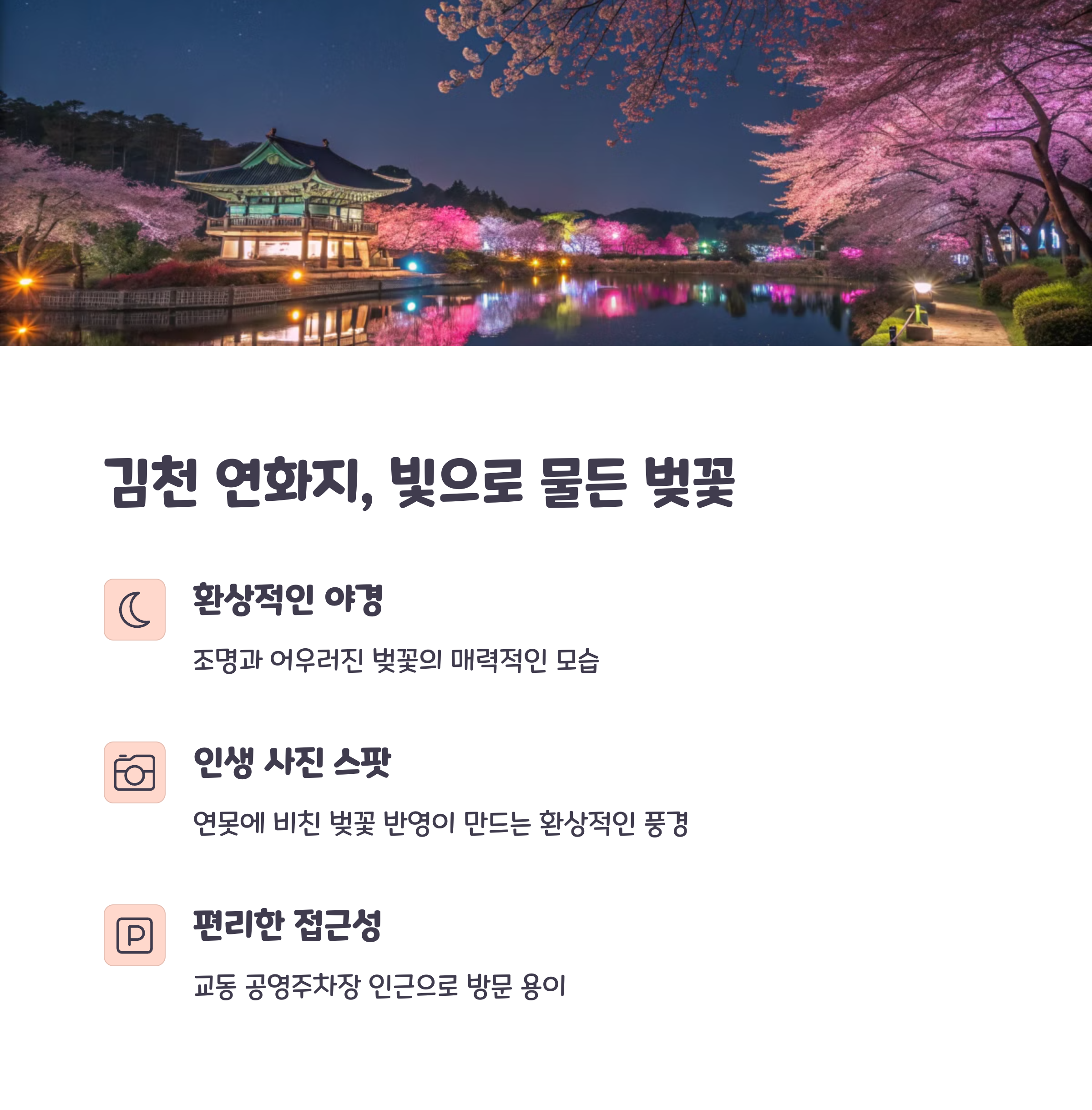 반면 김천 연화지는 밤이 되면 그 진가를 발휘합니다. 조명이 더해진 연화지 일대는 환상적인 야경을 만들어내며, 연인들의 데이트 코스로 특히 인기가 높아요. 연못 위를 감도는 벚꽃 그림자와 분수의 빛, 그리고 사람들의 웃음소리가 어우러져 도심 속 낭만을 완성합니다. 특히 연화지 일대에는 포토존도 마련되어 있어 인생샷을 남기기에 딱 좋습니다. 조용하면서도 분위기 있는 밤 벚꽃을 즐기고 싶다면, 이곳이 최적의 장소일 거예요.