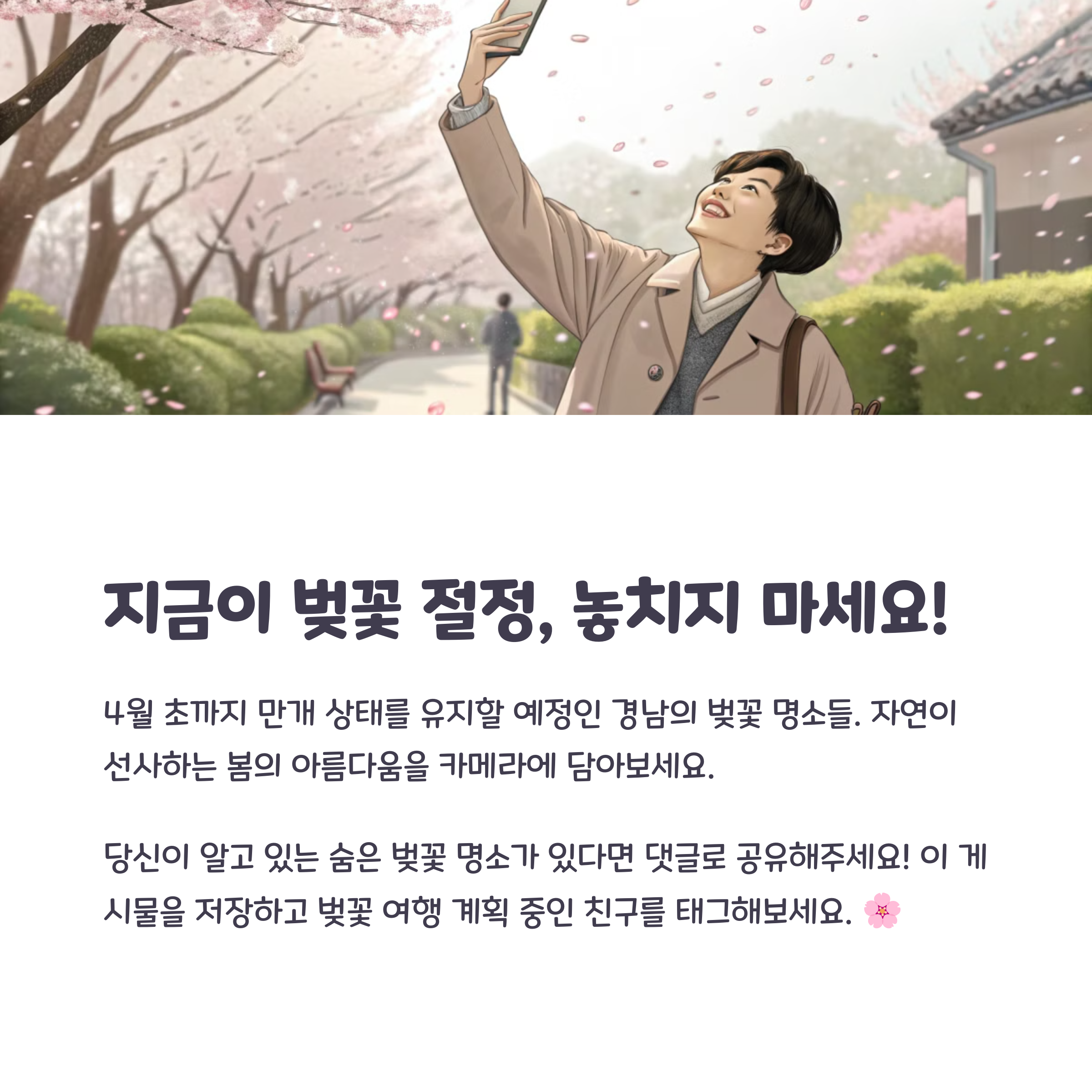 함께 걷고 싶은 벚꽃길, 가장 기억에 남는 벚꽃 명소, 혹은 지금 딱 추천하고 싶은 포토존이 있다면 댓글로 공유해주세요! 여러분의 추억이 또 다른 여행의 시작이 될지도 모릅니다.