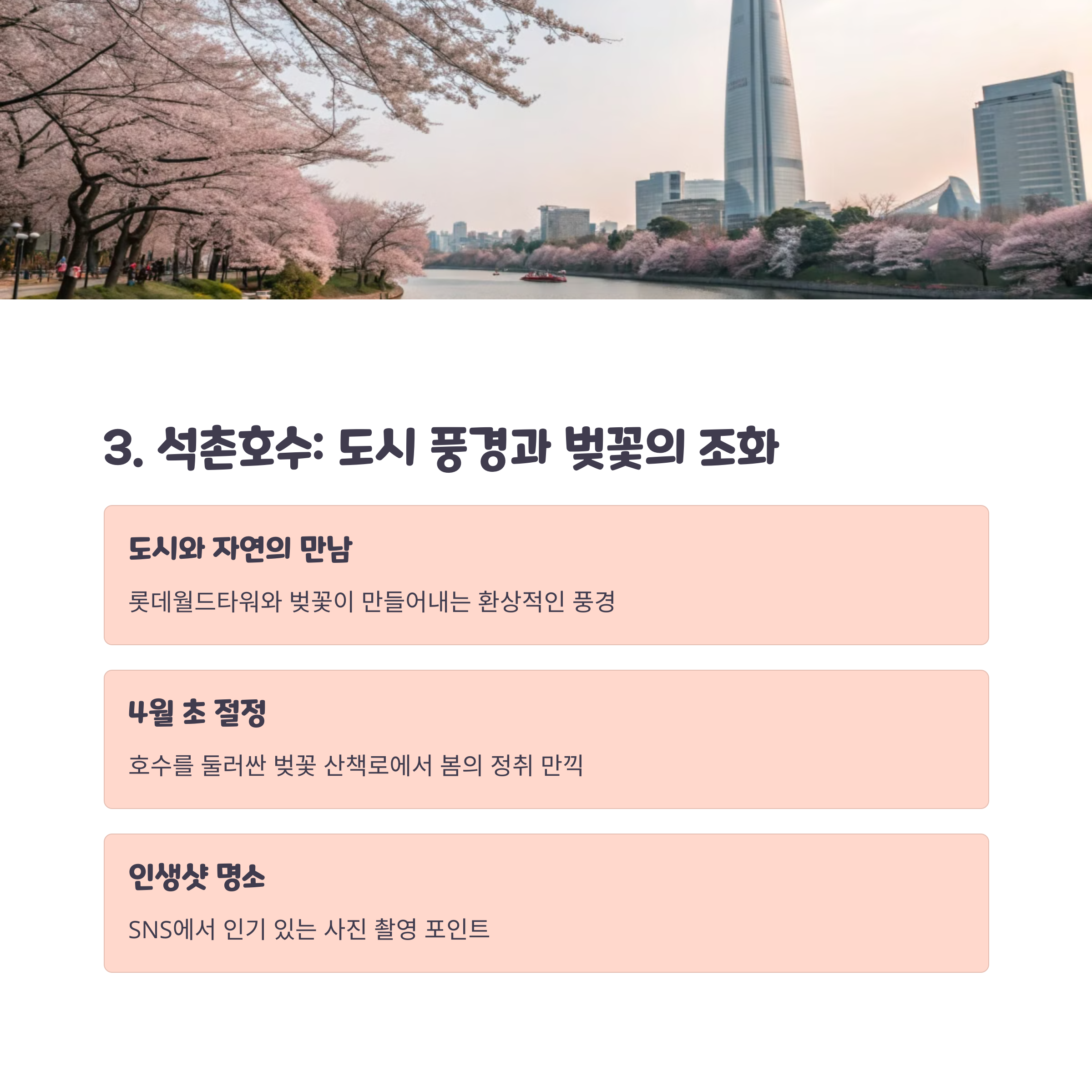 | 진해 군항제, 여의도 윤중로, 석촌호수, 보문호, 섬진강 벚꽃길 등 | 지역별로 3월 말부터 4월 초까지 상이하게 만개 | 사진 명소, 드라이브 코스, 야경 산책, 역사 탐방 등 다양 |