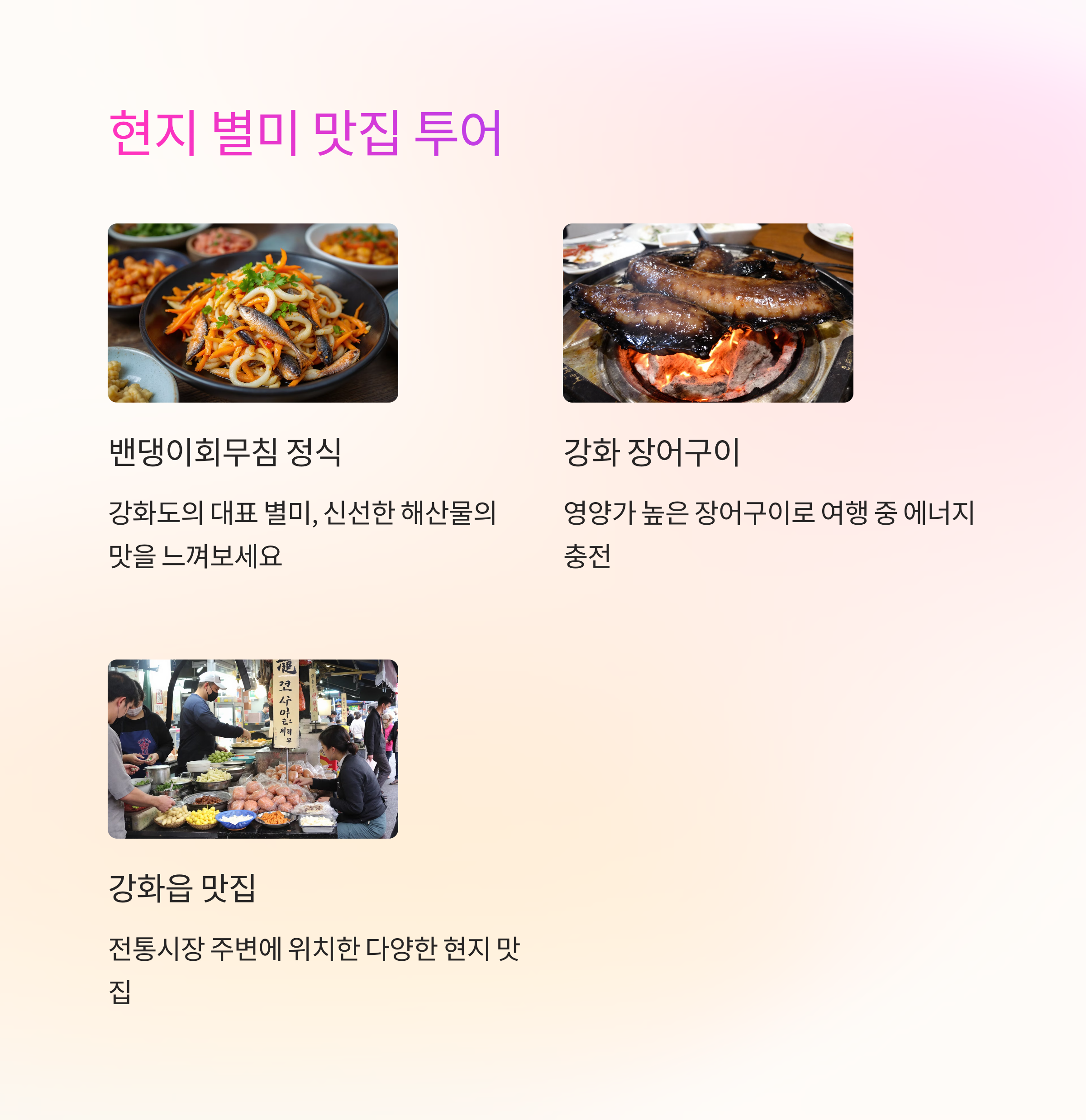 - 쇼핑 추천: 강화 순무김치, 새우젓, 강화인삼은 대표적인 기념품으로 좋습니다.