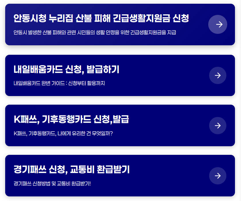 지금까지 소개한 안동시 산불 피해 지원금, 내일배움카드, K패스, 경기패스는 정부와 지자체에서 제공하는 다양한 혜택 중 일부에 불과합니다. 이러한 정보를 적극적으로 활용하면 매월 상당한 금액을 절약하거나 추가 지원을 받을 수 있습니다.