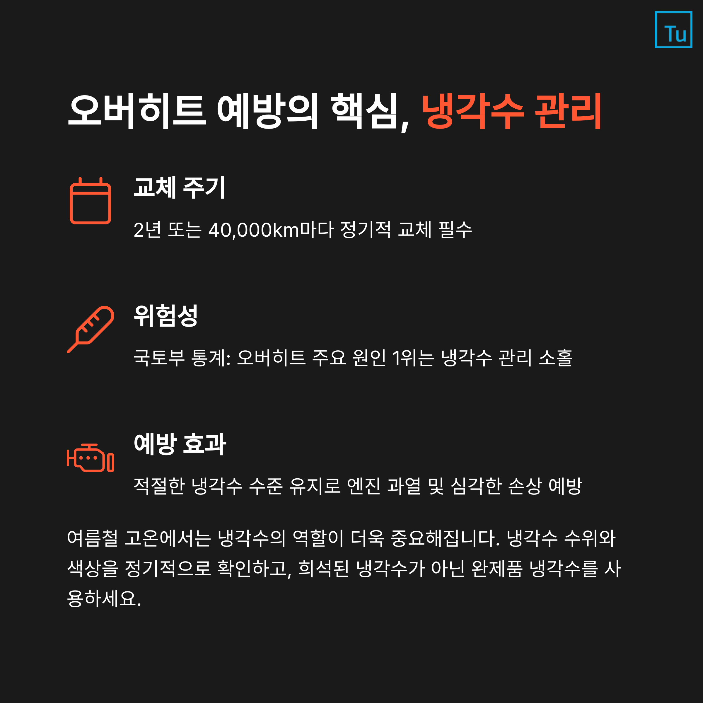 여름철 고온으로 인한 엔진 과열 방지를 위해 냉각수 점검은 필수입니다. 냉각수는 엔진의 온도를 적정 수준으로 유지해주는 중요한 역할을 합니다.