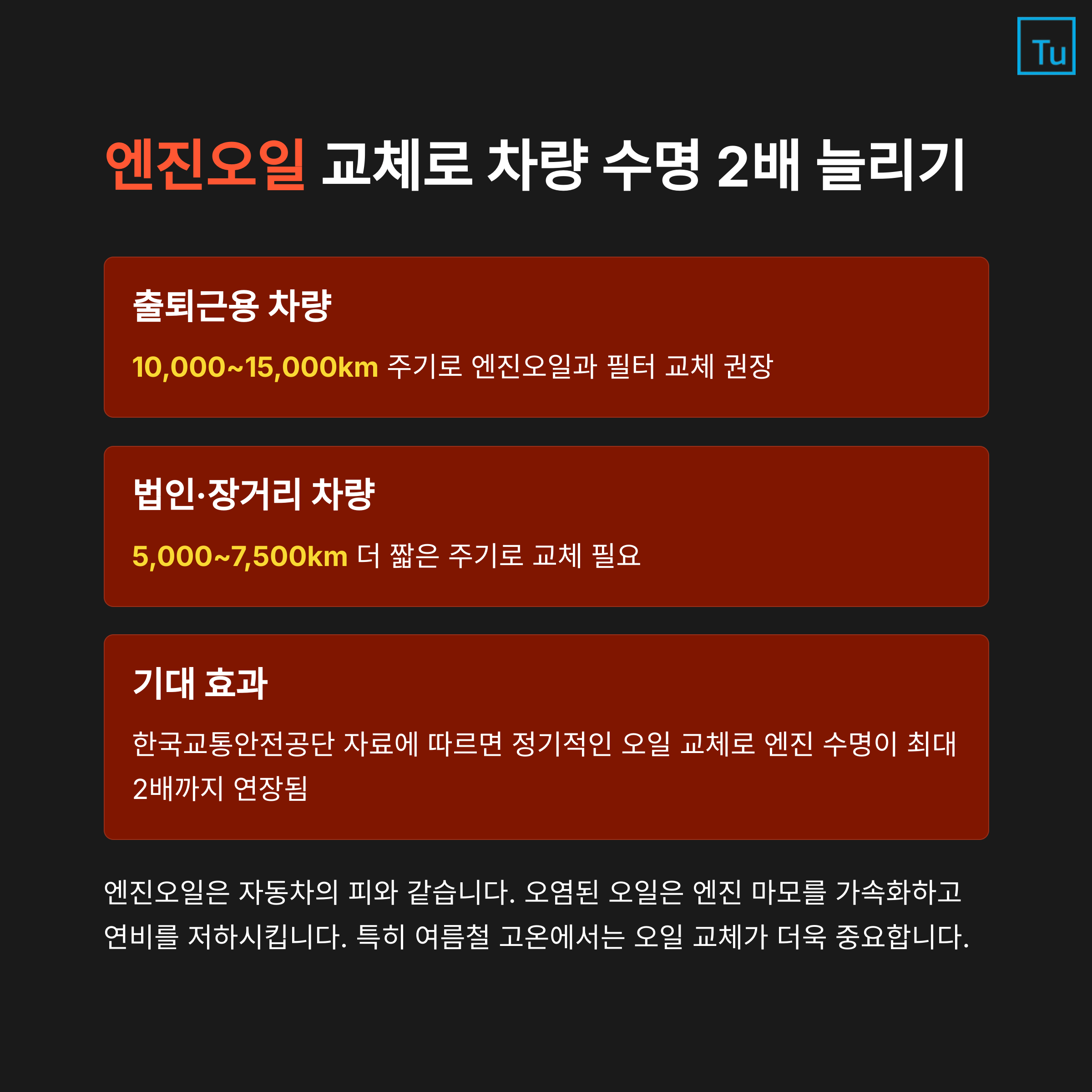 정기적인 엔진오일 교체는 연비 향상과 엔진 보호에 중요한 역할을 합니다. 특히 여름철에는 더 많은 관심이 필요합니다.
