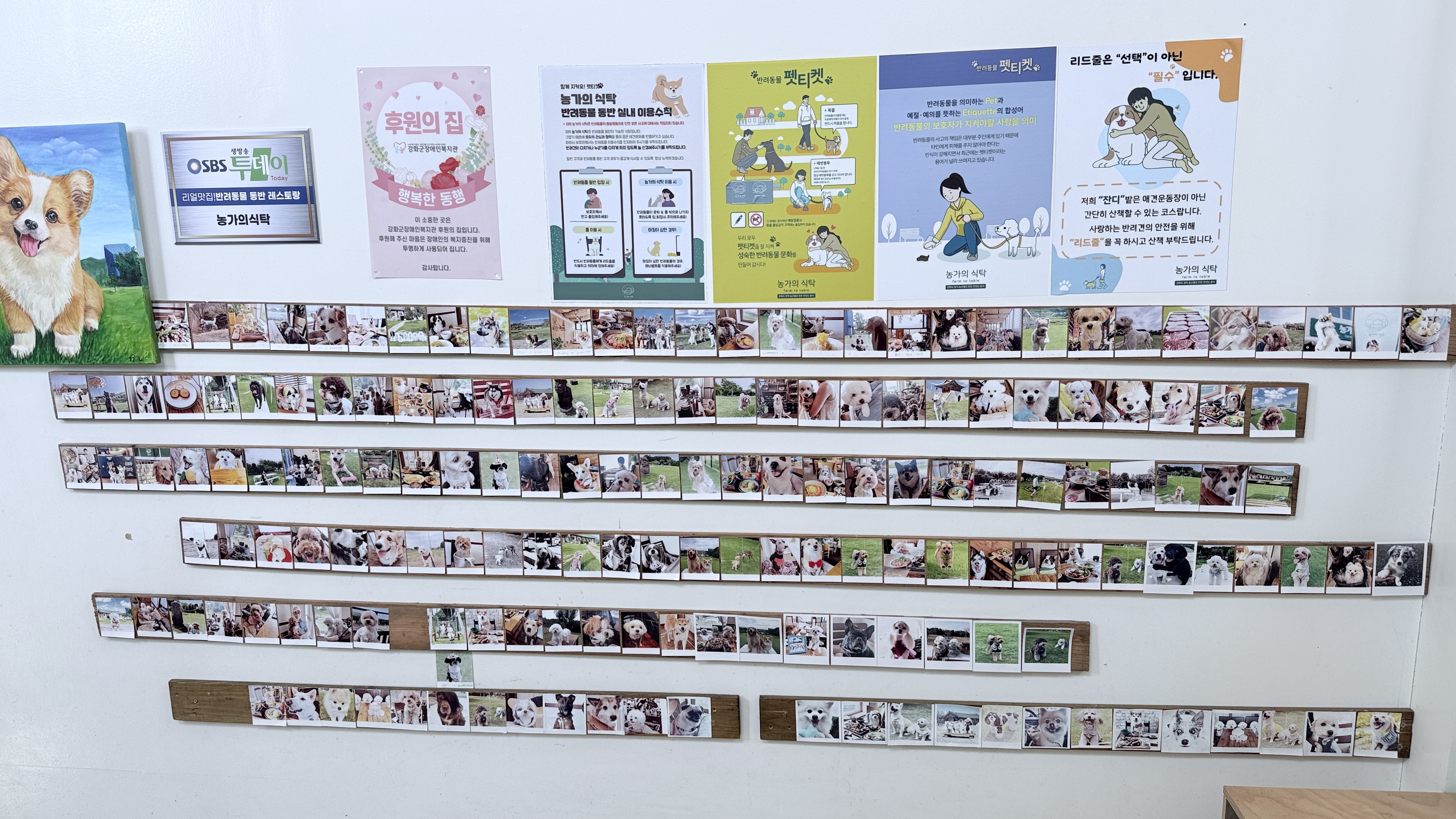 입구에는 방문한 강아지들의 사진이 전시되어 있어 반려견에 대한 애정을 느낄 수 있으며, 잔디정원과 연결된 단체석에서는 식사 후 반려견과 산책도 가능합니다.