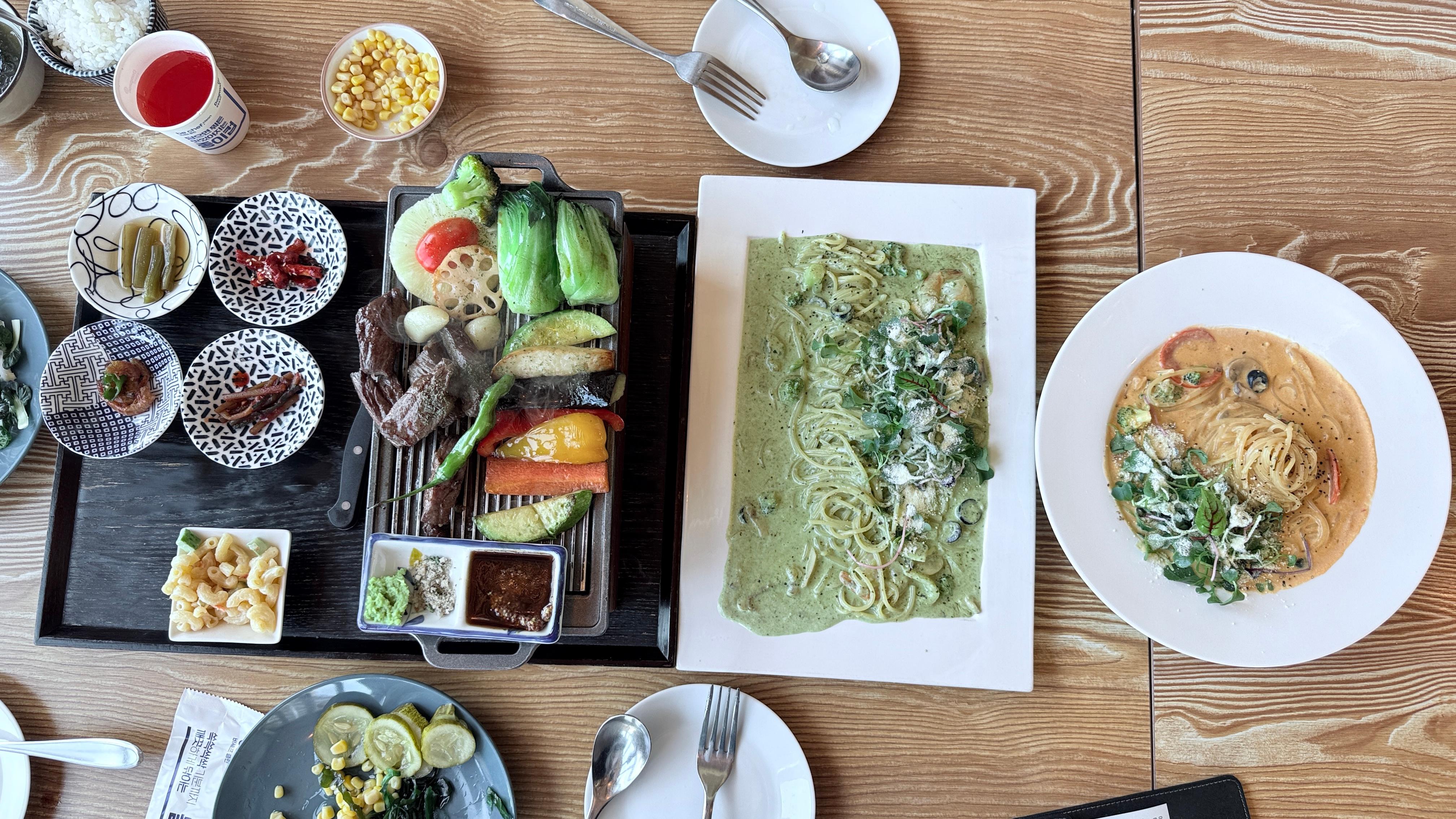 - 무료 샐러드바: 다양한 샐러드와 음료, 약쑥차 등을 무료로 즐길 수 있는 서비스가 인상적입니다.